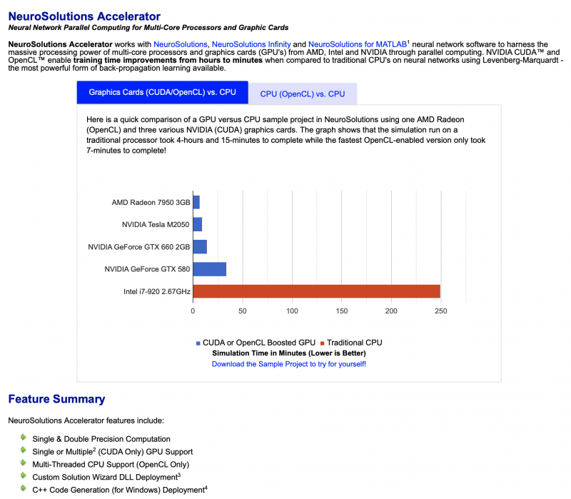 We also extended the GPU acceleration to work with NeuroSolutions Infinity, a package which searched a large space of models and tried to find the best model for your data.